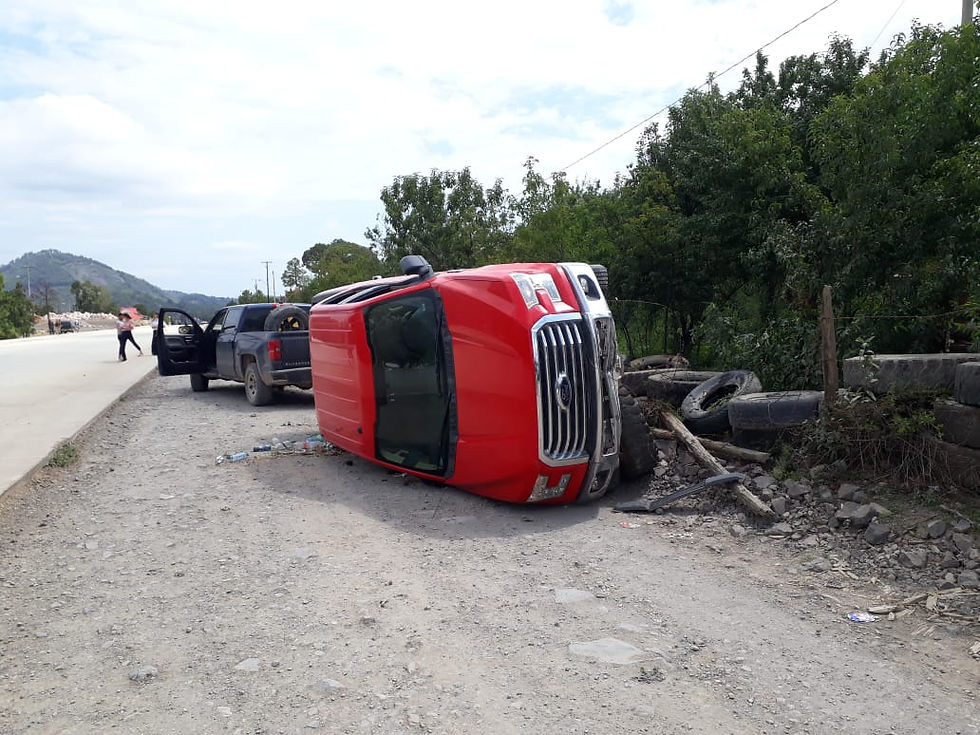 El vehículo en mención es una camioneta Ford, línea F-150, color rojo, doble cabina, sin placas de circulación la cual se hallaba volcada sobre su costado derecho y a unos metros se observa una huella de derrape.